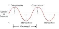 Sound waves are characterised by the motion of particles in the medium and are called mechanical waves. When a vibrating object moves forward, it pushes and compresses the air in front of it creating a region of high pressure. This region is called a compression (C). This compression starts to move away from the vibrating object.