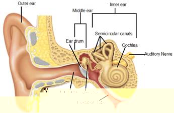 The outer ear is called ‘pinna’. It collects the sound from the surroundings. The collected sound passes through the auditory canal. At the end of the auditory canal there is a thin membrane called the ear drum or tympanic membrane. The vibrations are amplified several times by three bones (the hammer, anvil and stirrup) in the middle ear. The middle ear transmits the amplified pressure variations received from the sound wave to the inner ear.