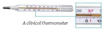 A clinical thermometer reads temperature from 35°C to 42°C.