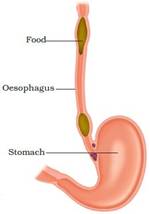 The swallowed food passes into the foodpipe or oesophagus. The foodpipe runs along the neck and the chest. Food is pushed down by movement of the wall of the foodpipe.