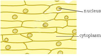 The boundary of the onion cell is the cell membrane covered by another thick covering called the cell wall. The central dense round body in the centre is called the nucleus. The jelly-like substance between the nucleus and the cell membrane is called cytoplasm.