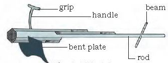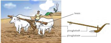 Hoe : It is a simple tool which is used for removing weeds and for loosening the soil. It has a long rod of wood or iron. A strong, broad and bent plate of iron is fixed to one of its ends and works like a blade.