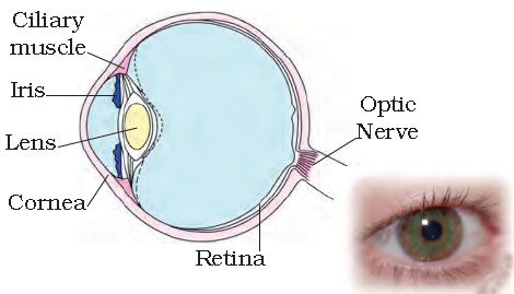 The eye has a roughly spherical shape. The outer coat of the eye is white. It is tough so that it can protect the interior of the eye from accidents. Its transparent front part is called cornea.