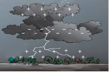 When the positive charges collect near the upper edges of the clouds and the negative charges accumulate near the lower edges. There is accumulation of positive charges near the ground also. When the magnitude of the accumulated charges becomes very large, the air which is normally a poor conductor of electricity, is no longer able to resist their flow. Negative and positive charges meet, producing streaks of bright light and sound. Then we see the lightning and the process is known as electric discharge.