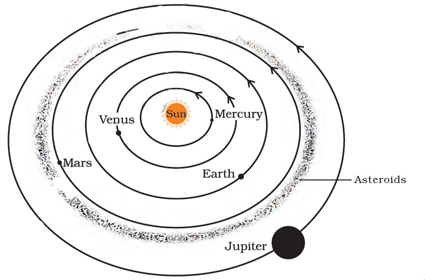There is a large gap in between the orbits of Mars and Jupiter. This gap is occupied by a large number of small objects that revolve around the Sun. These are called asteroids. Asteroids can only be seen through large telescopes.