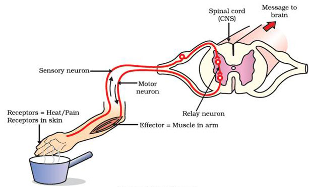 Nerves from all over the body meet in a bundle in the spinal cord on their way to the brain. Reflex arcs are formed in this spinal cord itself, although the information input also goes on to reach the brain. Of course, the reflex arcs have evolved in animals because the thinking process of the brain is not fast enough. In fact many animals have very little or none of the complex neuron network needed for thinking. So it is quite likely that reflex arcs have evolved as efficient ways of functioning in the absence of true thought processes.