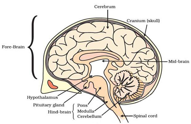 Spinal cord is made up of nerves which supply information to think about. Thinking involves more complex mechanisms and neural connections. These are concentrated in the brain, which is the main coordinating centre of the body. The brain and spinal cord constitute the central nervous system. They receive information from all parts of the body and integrate it.