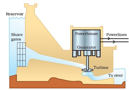 In order to produce hydel electricity, high-rise dams are constructed on the river to obstruct the flow of water and thereby collect water in larger reservoirs. The water level rises and in this process the kinetic energy of flowing water gets transformed into potential energy. The water from the high level in the dam is carried through pipes, to the turbine, at the bottom of the dam.