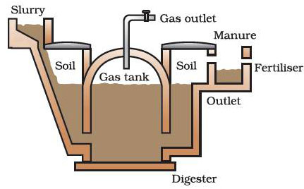 When wood is burnt in a limited supply of oxygen, water and volatile materials present in it get removed and charcoal is left behind as the residue. Charcoal burns without flames, is comparatively smokeless and has higher heat generation efficiency. Cow-dung, it is popularly known as ‘gobar-gas’. Bio-gas is produced in a plant here –