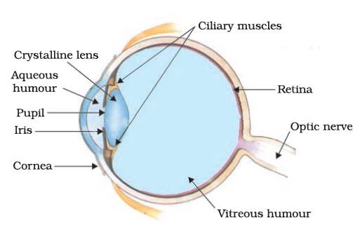 The eyeball is approximately spherical in shape with a diameter of about 2.3 cm. Most of the refraction for the light rays entering the eye occurs at the outer surface of the cornea. The crystalline lens merely provides the finer adjustment of focal length required to focus objects at different distances on the retina. We find a structure called iris behind the cornea. Iris is a dark muscular diaphragm that controls the size of the pupil. The pupil regulates and controls the amount of light entering the eye.