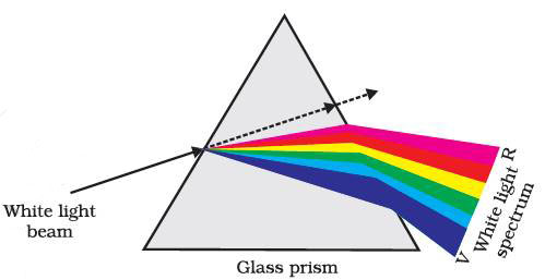 The various colours seen are Violet, Indigo, Blue, Green, Yellow, Orange and Red. The acronym VIBGYOR will help you to remember the sequence of colours. The band of the coloured components of a light beam is called its spectrum.