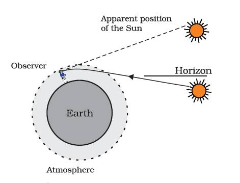 The atmospheric refraction occurs in a medium of gradually changing refractive index. Since the atmosphere bends starlight towards the normal, the apparent position of the star is slightly different from its actual position. The star appears slightly higher (above) than its actual position when viewed near the horizon.