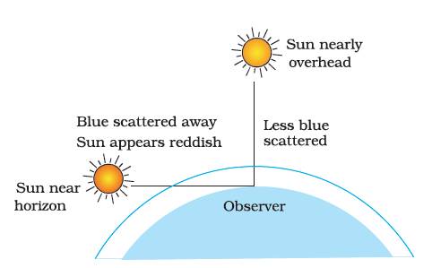 Light from the Sun overhead would travel relatively shorter distance. At noon, the Sun appears white as only a little of the blue and violet colours are scattered. Near the horizon, most of the blue light and shorter wavelengths are scattered away by the particles. Therefore, the light that reaches our eyes is of longer wavelengths. This gives rise to the reddish appearance of the Sun.